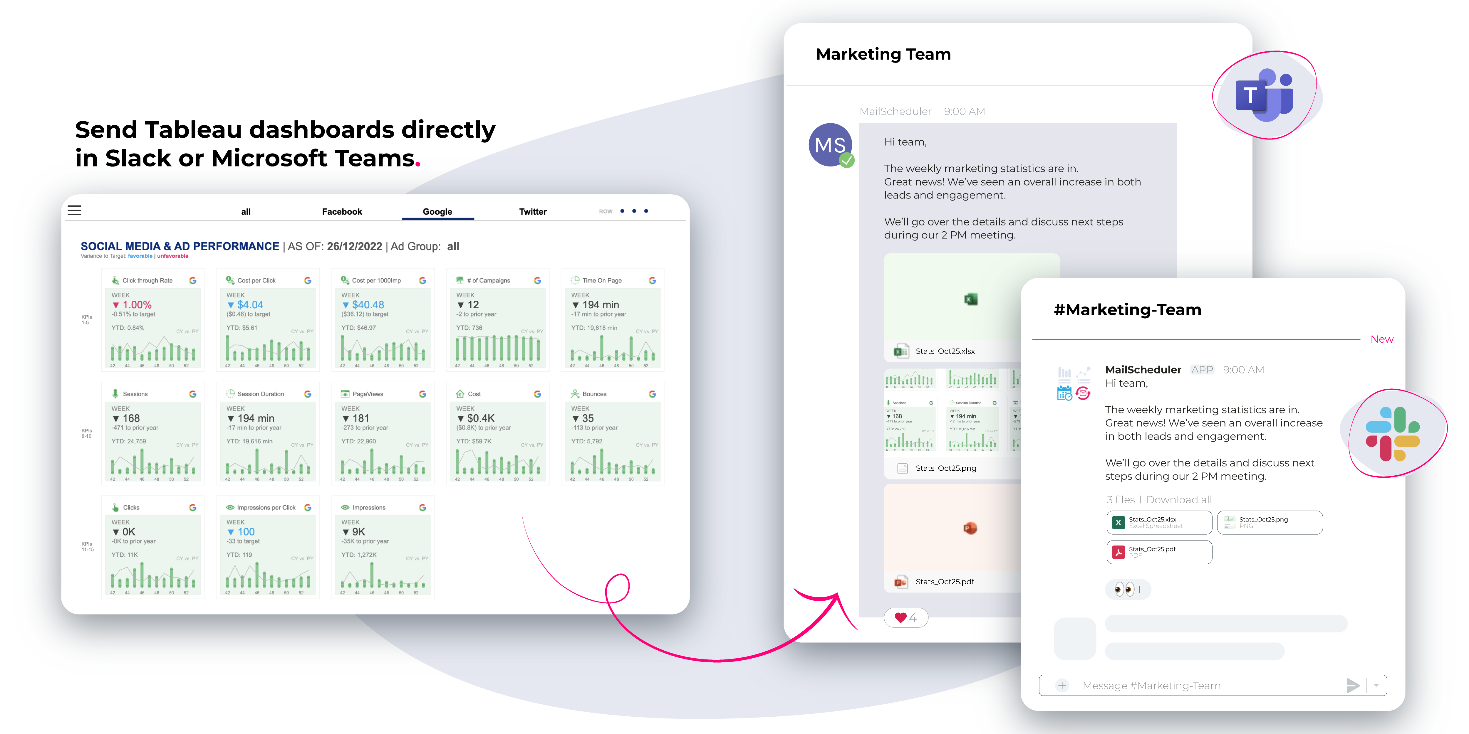Now, it is easier than ever to share insights directly where your team collaborates. With MailScheduler you can deliver dashboard views as images, PDFs, CSVs, and Excel files, directly to Teams channels or private chats.