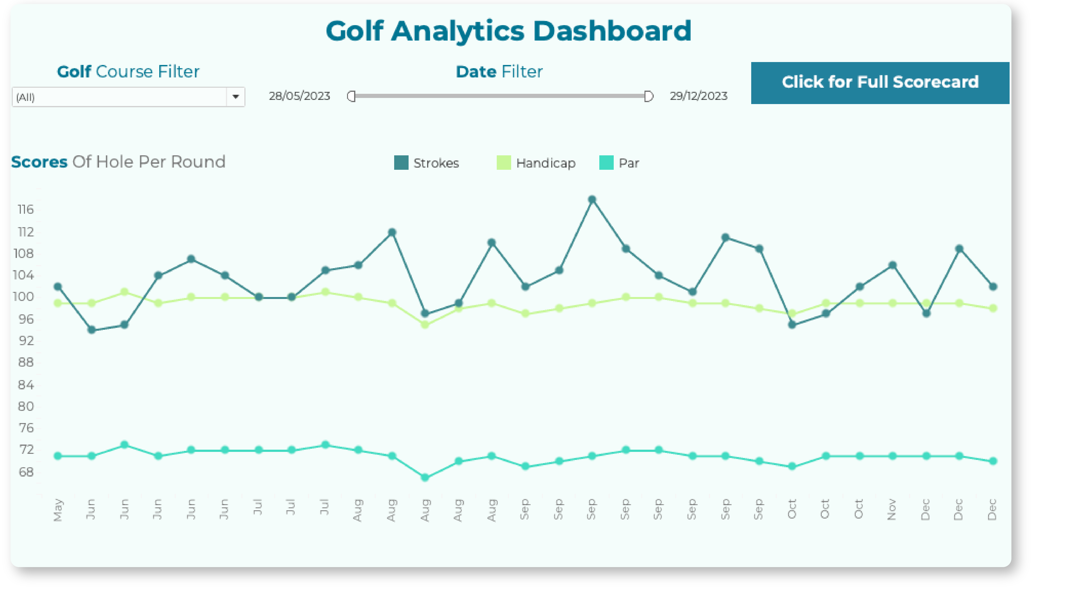 All golfers seek ways to improve their game, whether it be a new set of golf clubs, lessons from a club pro or playing as often as they can. With this dashboard, users can use Tableau to check if their game improvements are making a difference. The highlight of the dashboard is Apps for Tableau’s Sunburst Diagram showing what scores they got on each par, giving great insight in to which par they need to improve in.